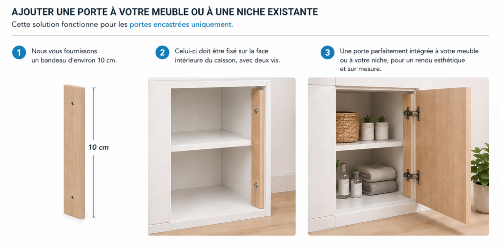 Sur cette page, vous pouvez équiper un meuble ou une niche déjà en place avec une porte.